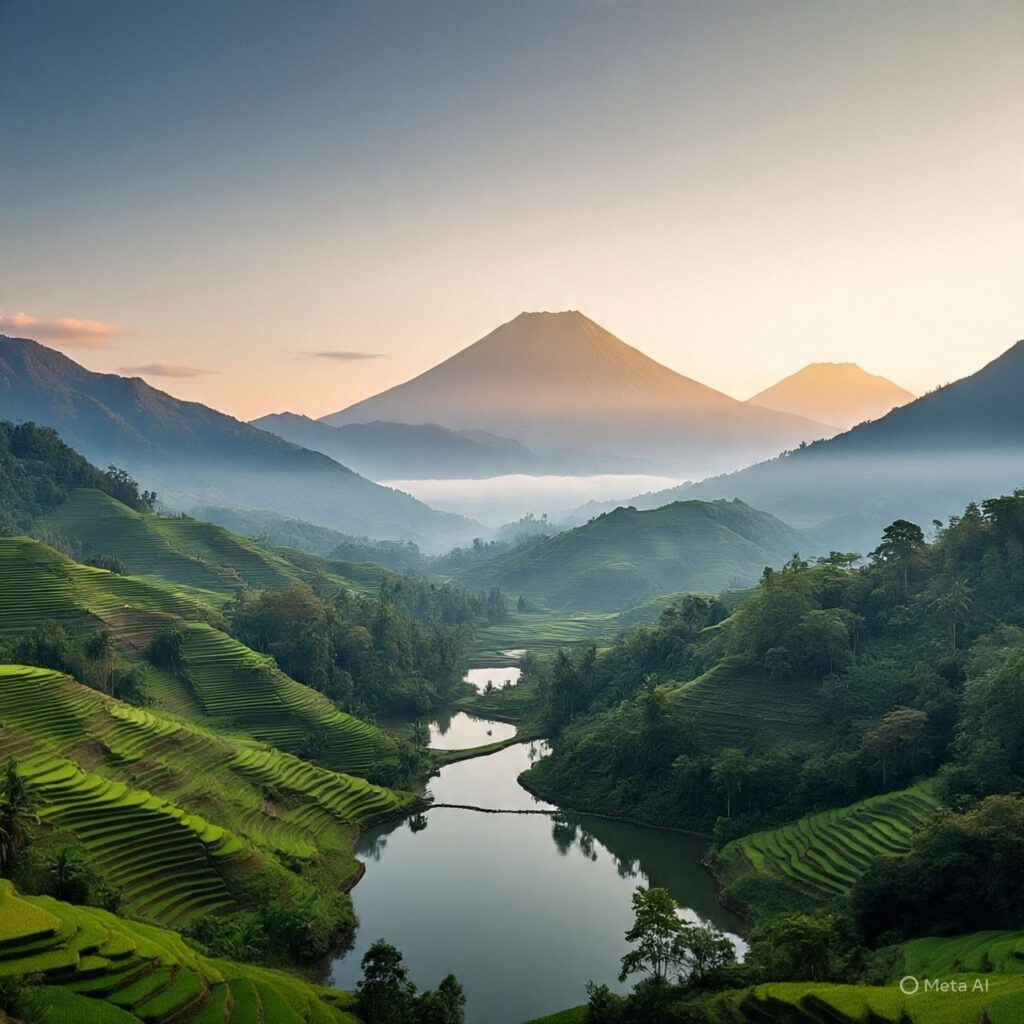 Pegunungan yang hijau dengan kabut tipis juga menawarkan keindahan tersendiri. Puncak-puncak gunung yang menjulang tinggi, dengan hutan lebat dan tanaman hijau yang rimbun, menciptakan pemandangan yang sangat alami dan menenangkan. Di malam hari, bintang-bintang yang berkelap-kelip di langit menambah kesan dramatis dan memukau.