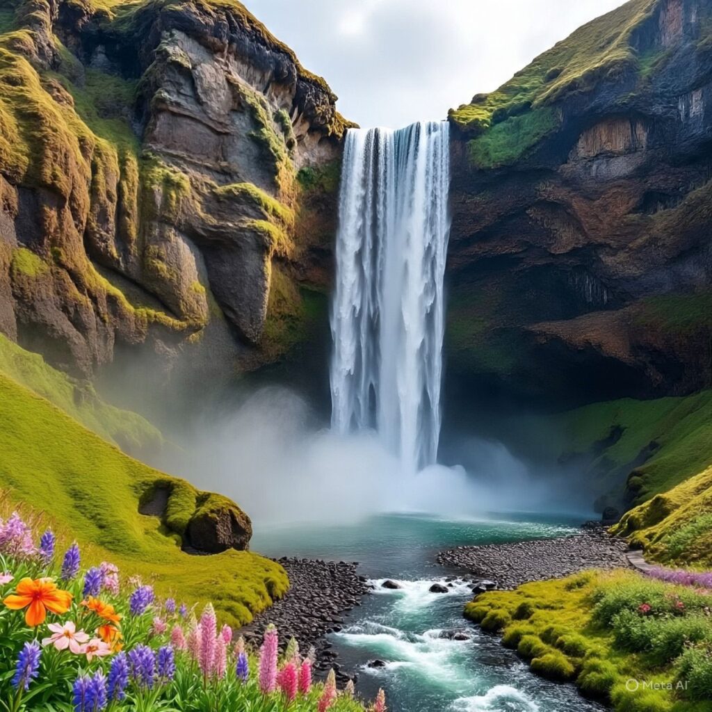 Air terjun yang mengalir deras juga merupakan contoh pemandangan alam yang mempesona. Suara gemuruh air yang jatuh dan menciptakan kabut tipis menambah kesan magis dan menenangkan. Di sekitar air terjun, tanaman hijau yang rimbun dan bunga-bunga liar yang berwarna-warni menambah keindahan pemandangan.